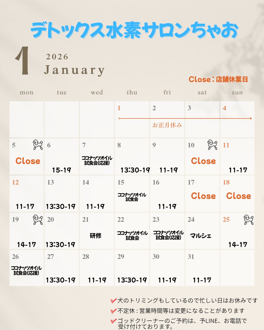 ※「close」マークの日はお休みとさせていただきます。
