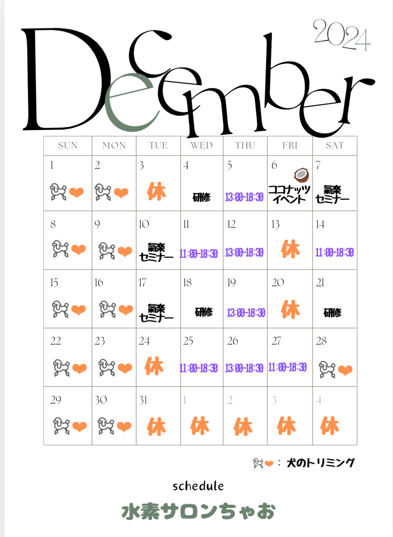 皆さんこんにちは❣️水素サロンちゃおのRITSUです🤗 12月の営業日カレンダーです🥰 今年も早いも […] -