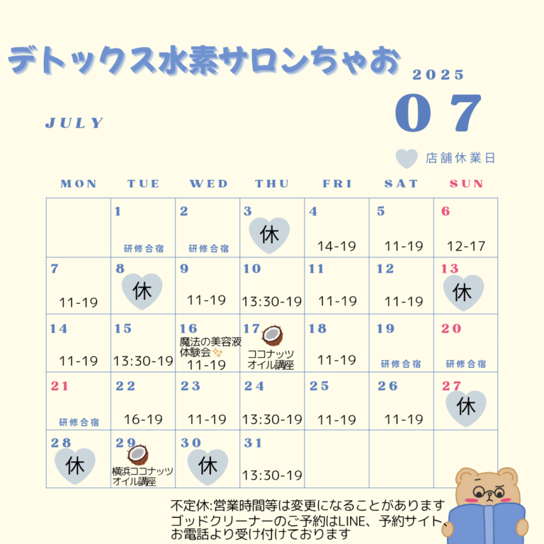 7月のカレンダー遅くなりました💦 ️🩵今月のココナッツオイル講座&ランチ会は7月17日(木曜日)です […]